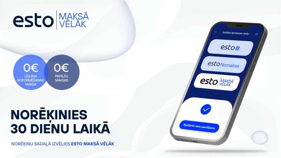 ESTO Maksā vēlāk ir gudrs veids, kā norēķināties un saņemt preces uzreiz un atmaksāt pirkuma summu 30 dienu laikā. Iegūstiet tieši to, kas Jums nepieciešams, ar dažiem klikšķiem – bez procentiem, bez papildu maksas. ESTO Maksā vēlāk pakalpojums pieejams internetveikalos un klātienes veikalos. Apmeklējiet esto.lv, lai iepazītos ar ESTO partnerveikaliem, kuros jau izmanto ESTO Maksā vēlāk: https://esto.eu/lv/esto-market