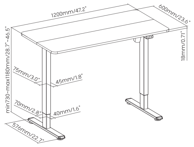 1200 x 600 x 730 ~ 1180 mm |