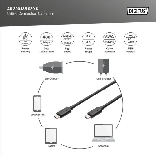 Digitus AK-300138-030-S USB-C Cable, USB-C 2.0 Male į USB-C 2.0 Male, 3 m, Black