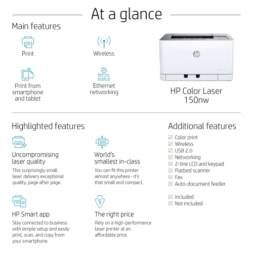 | Apraksts: | HP Color Laser 150nw – Printer – colour – laser – A4/Legal – 600 x 600 dpi 4 ppm (colour) – up to 18 ppm – capacity: 150 sheets – USB 2.0, LAN, Wi-Fi(n) |