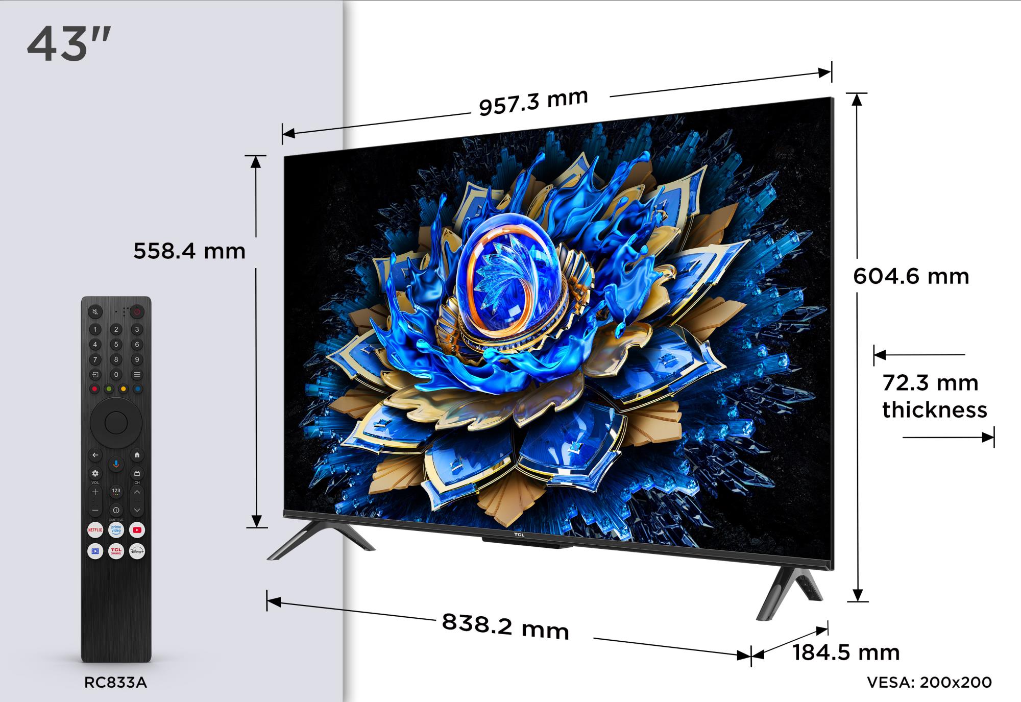 43 ” | QLED | Flat | 16:9 | Brightness 350 cd/m² | 3840 x 2160 pixels | Smart TV Yes | Wi-Fi Yes | Weight 6.7 kg